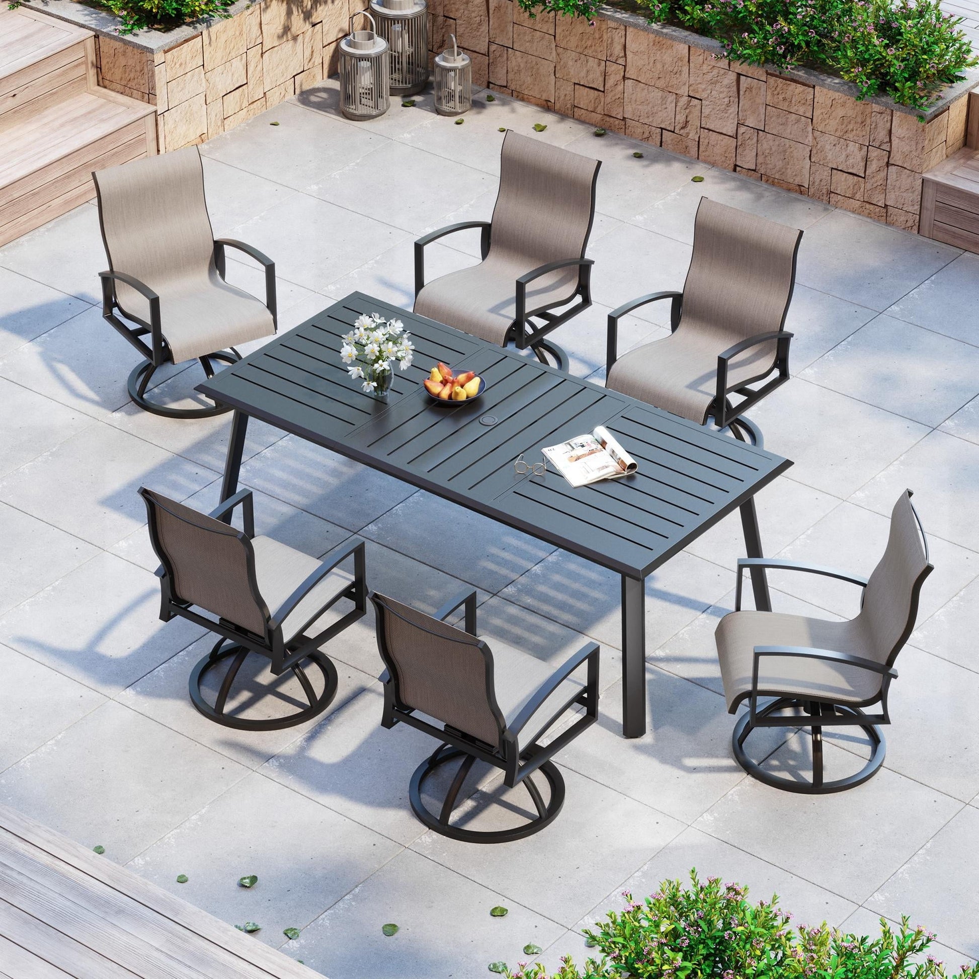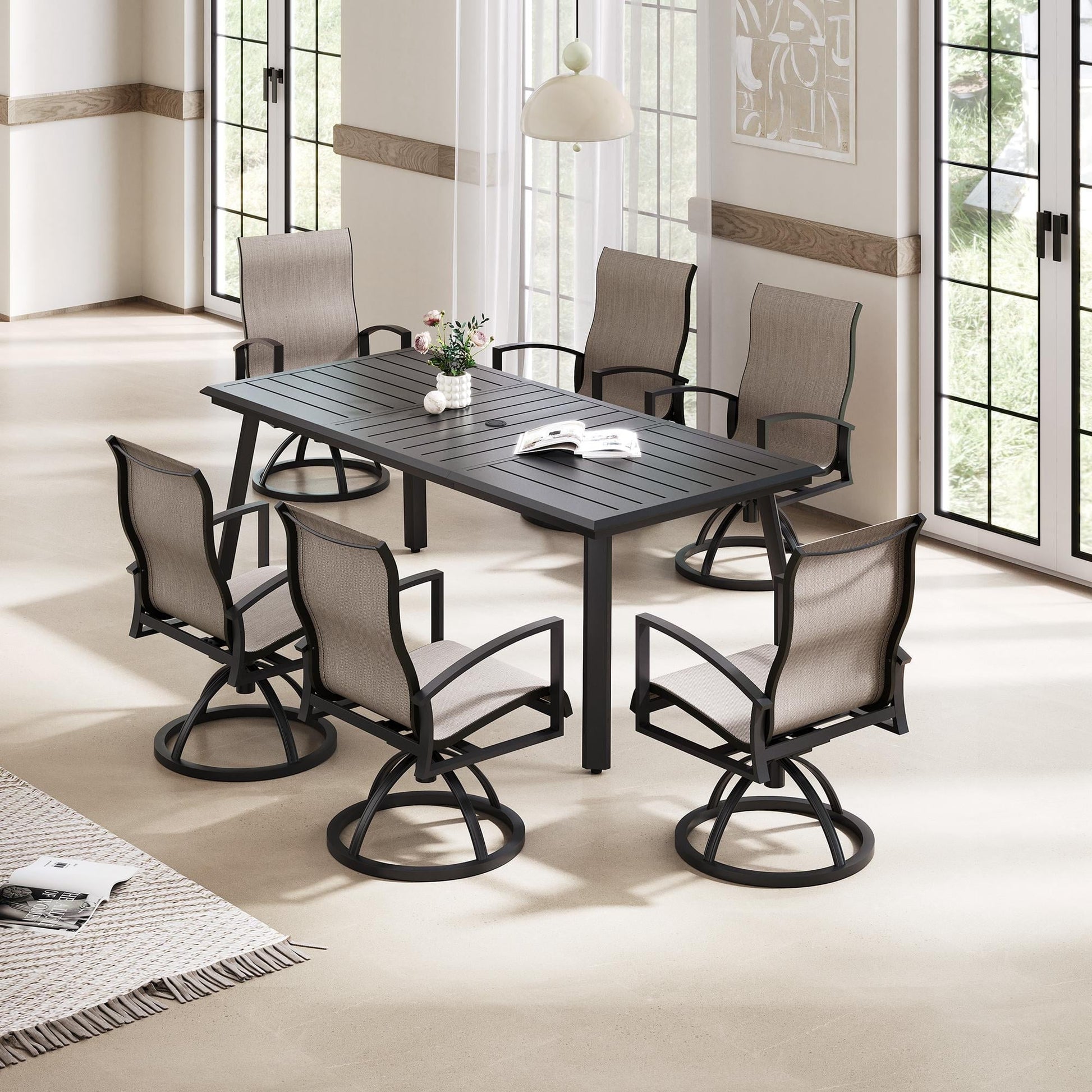 Create a modern and inviting outdoor dining space with the Pellebant Aluminum Patio Dining Table. Measuring 82.7 inches long and 38 inches wide, this spacious table easily accommodates 6 to 8 guests, making it perfect for entertaining outdoors. Constructed with a sturdy all-aluminum frame and a glossy black powder-coated finish, it offers excellent durability and resistance to rust and corrosion. The slatted tabletop design allows rainwater to drain easily and includes a 1.7' umbrella hole for sun protection. Adjustable foot pads provide stability on uneven surfaces and help prevent ground scratches. With clear instructions and included tools, assembly is quick and easy. Whether you place it on your deck, garden, patio, or poolside, the Pellebant dining table blends style and functionality to enhance any outdoor setting.