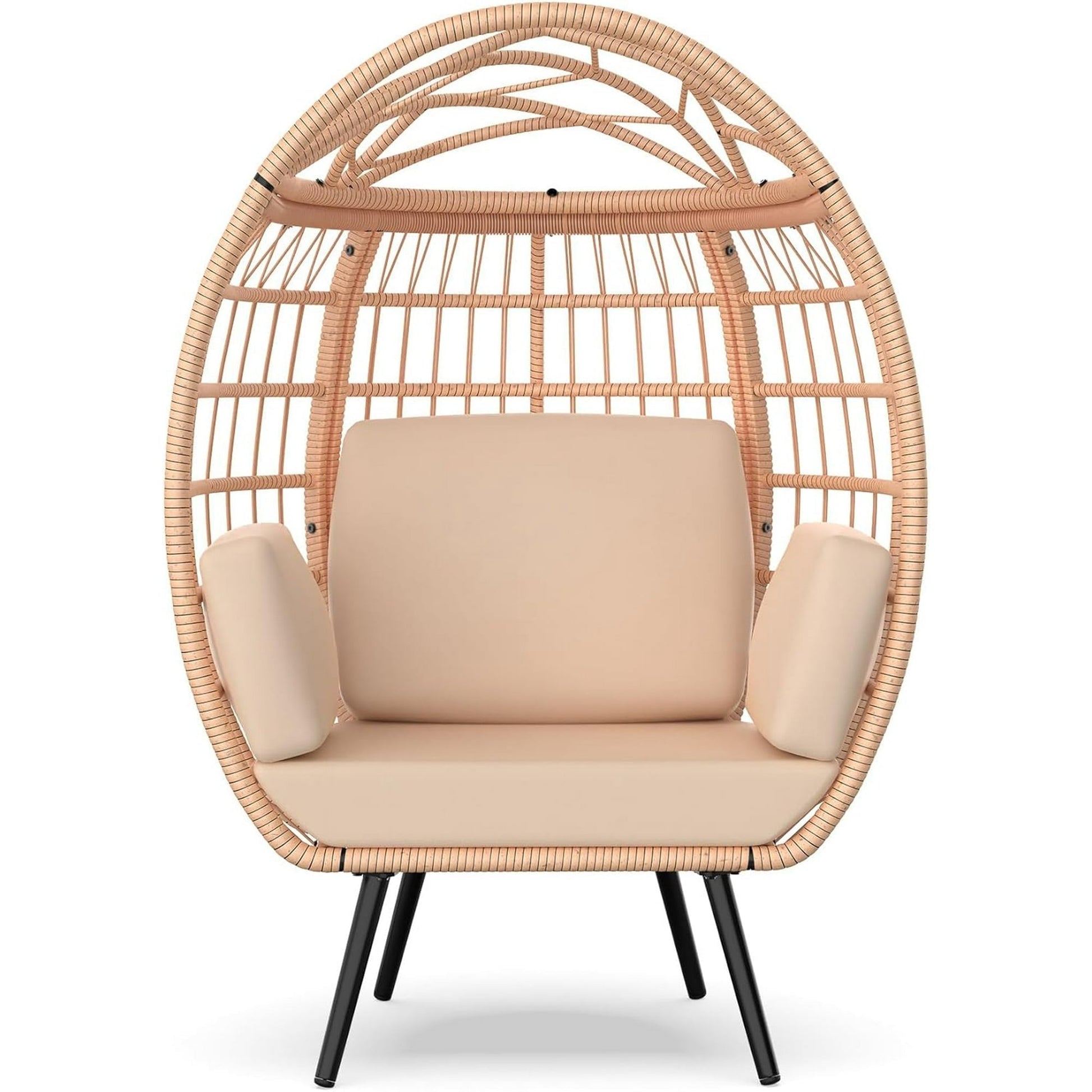 PNKKODW Wicker Standing Egg Chair w/ UV Cushions & Storage Bag, 370lb Capacity, Boho Egg Lounger for Indoor/Outdoor, Brown-Brown