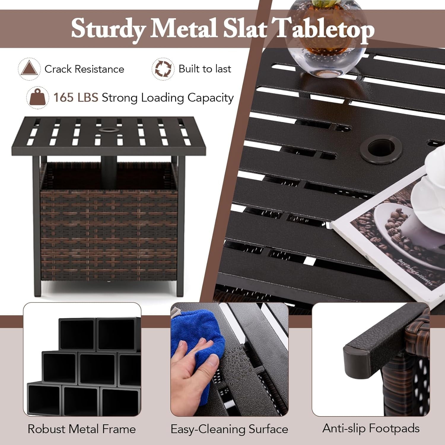 SUPQ Outdoor Side Table with Umbrella Hole, 22" Wicker Umbrella Stand Holder and Base, Weather-Resistant PE Rattan Patio End Table for Deck Garden Poolside (Metal Tabletop, Brown)