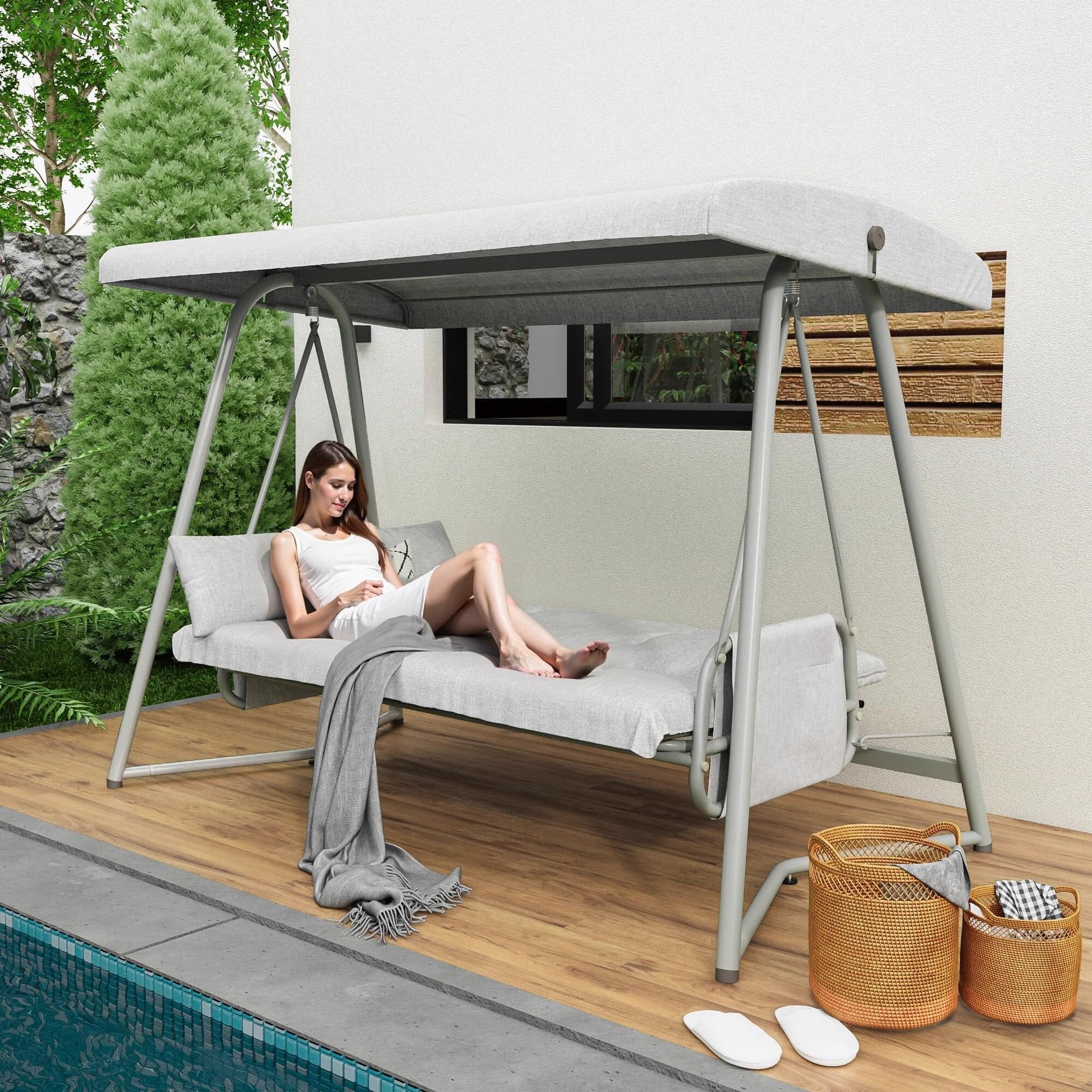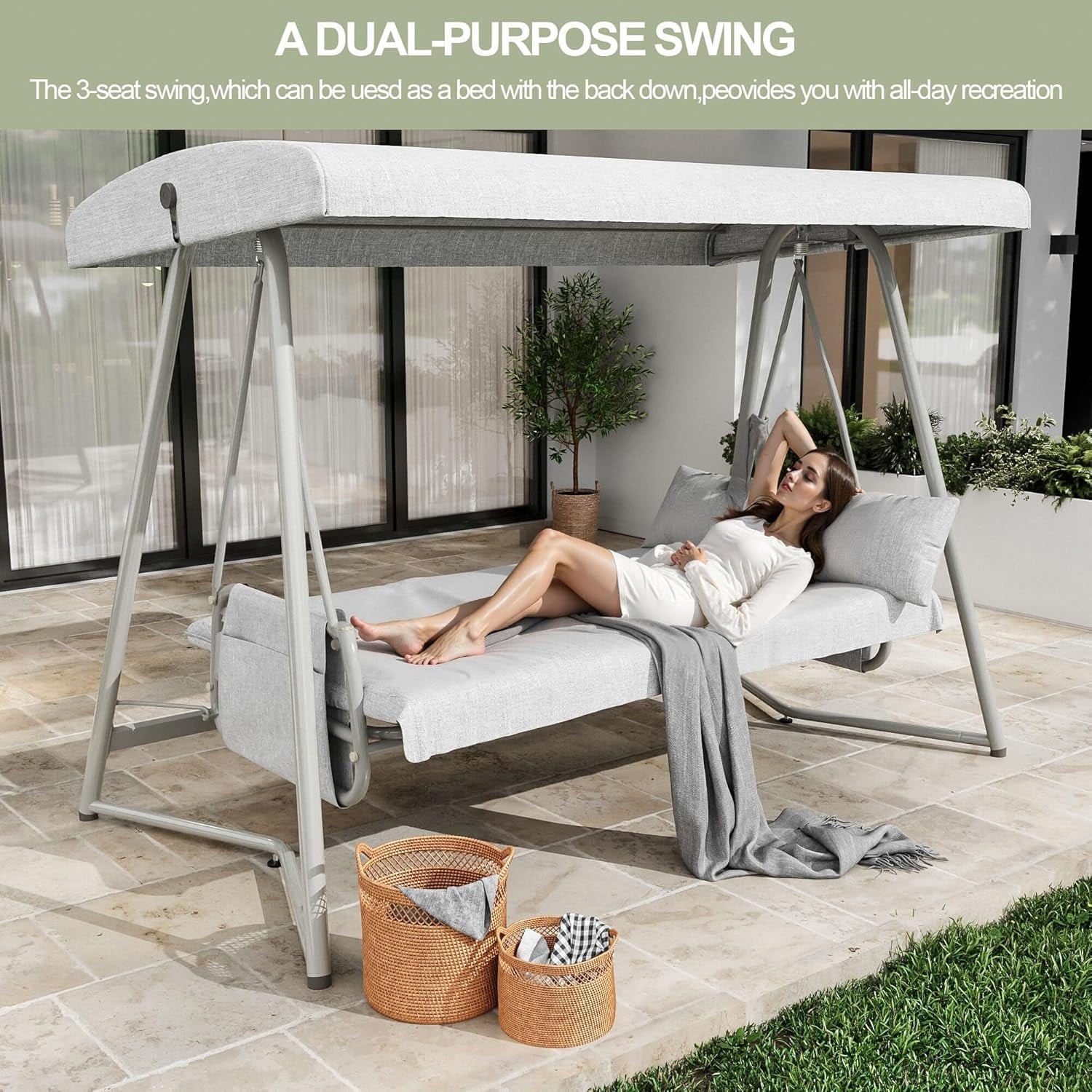 3 - 4 Person Oversized Outdoor Porch Swing: Ultimate Patio RelaxationTransform your outdoor space into a cozy retreat with our 3 - 4 Person Oversized Outdoor Porch Swing!Key Features:Spacious & Sturdy: Accommodates 3 - 4 people, boasting an 800 lbs weight capacity. Perfect for gatherings on your yard, garden, poolside, or balcony.2 - in - 1 Design: Switch between a comfortable swing and a laid - back bed effortlessly. The adjustable backrest lets you find your ideal lounging angle.Customizable Shade: The adjustable canopy blocks harsh sun rays, keeping you cool. Enjoy morning coffee or evening chats in comfort.Easy Maintenance: Removable cushions make cleaning a breeze. Keep your outdoor seating fresh all season long.Why Choose Our Swing?Designed for durability and relaxation, this patio swing combines style and function. Whether you’re hosting friends or enjoying quiet time, it’s the perfect addition to your outdoor setup.Upgrade your outdoor living—order now and turn your patio into a favorite hangout!