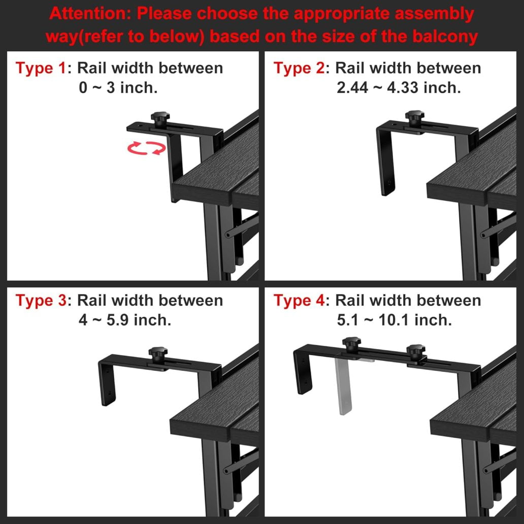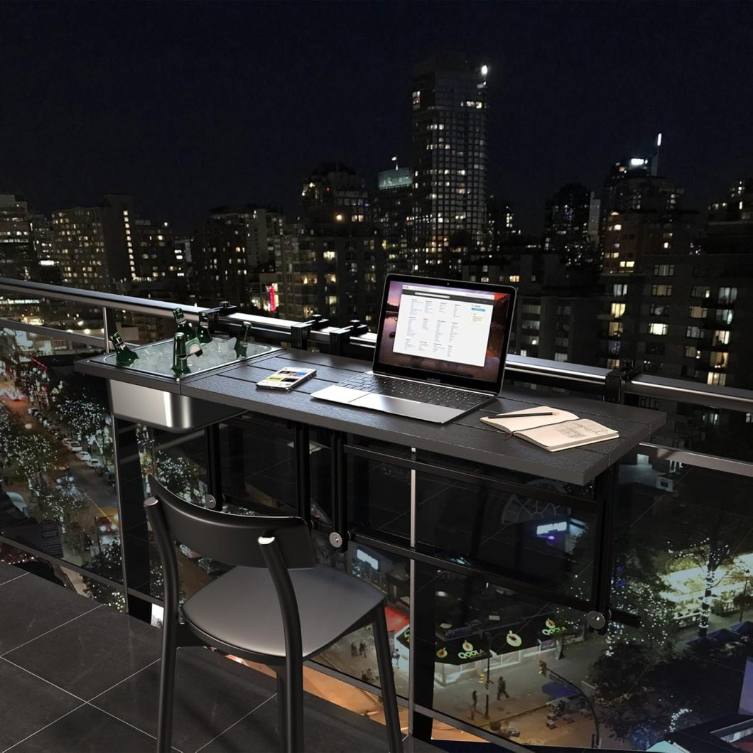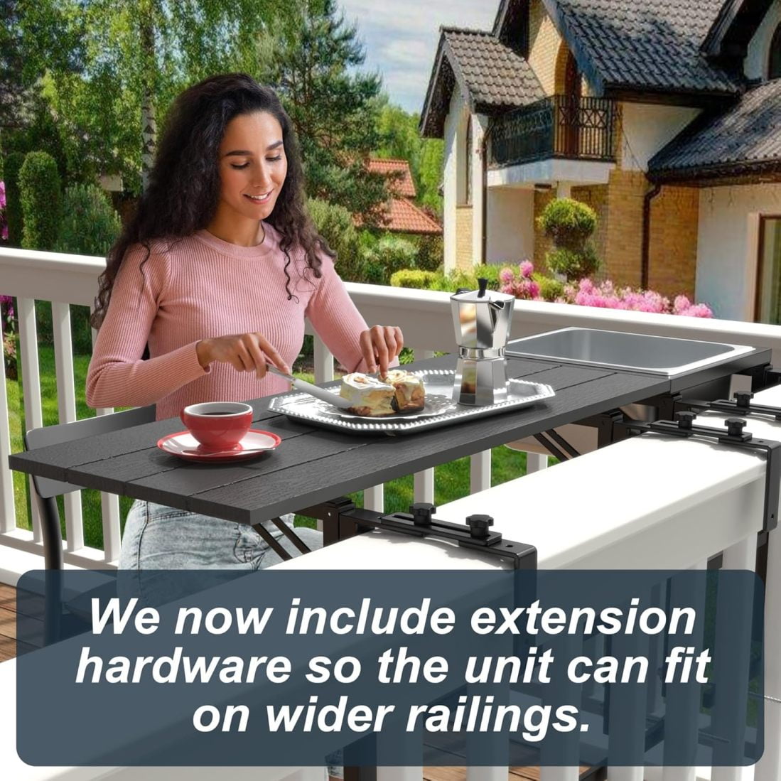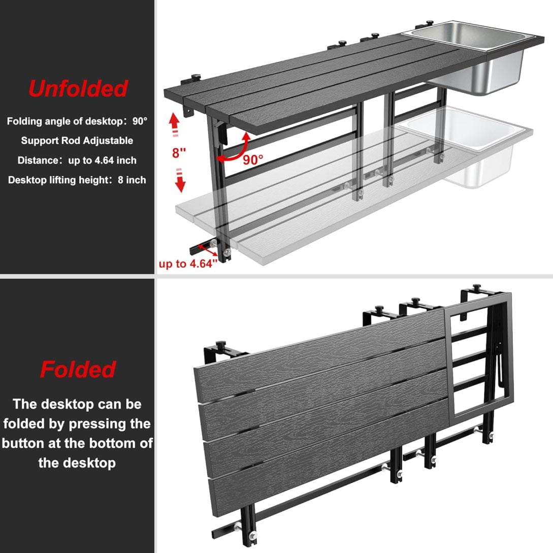 This balcony table is made of premium high quality wood-plastic composites and aluminum alloy frame, which looks very high-end. The patented bracket ensures the durability of use and the convenience of operation. You can set it up with one step and fold it down with one button. The materials it is engineered with make it durable for outdoor use, waterproof, sun-proof, etc Easy instructions allow you to install it in 10 minutes. It can be applied to railings of different widths, and the height of the tabletop can also be adjusted. Equipped with a removable stainless steel ice bucket, you can put beer or drinks in it without having to go back and forth to the kitchen frequently to get drinks. You can enjoy your balcony space more, drink and chat with friends, and read and work on it. This versatile unit will bring so much more function and livability to your outdoor space. Overall size:43.5'*13.77'*20.6' Sink inside size: 11.8'*9.4'*5.9'H - Weight Capacity 80lbs. 'IMPORTANT: Please measure your balcony railing to ensure this unit will fit properly. See image #4 for details