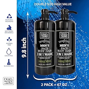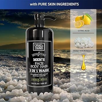 - Pure Dead Sea minerals - as a men's s face and body wash, it gently cleanses without drying the skin, providing essential nutrition. When used as a shampoo for men, it keeps hair moisturized and manageable, making it the perfect choice for the best mens body wash!