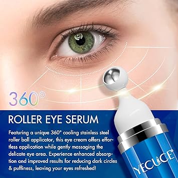 EYE SERUM Yecuce Advanced Eye Serum features a 360° stainless-steel roller-ball applicator that delivers a refreshing, cooling sensation. Infused with 5% Caffeine, Retinol, Hyaluronic Acid, and Niacinamide, this powerful serum targets dark circles and puffiness while deeply hydrating the delicate under-eye area. It enhances blood circulation, constricts blood vessels, and improves skin texture, resulting in a smoother, more radiant appearance. Experience a visible reduction in fine lines and an overall brighter, revitalized look with every use. KEY BENEFITS: Reduces puffiness and dark circles Smooths fine lines and wrinkle appearance Hydrates and restores skin barrier Noticeable and effective results INGREDIENTS: Water, Caffeine, Maltodextrin, Glycerin, Butylene Glycol, Propylene Glycol, Catechins (Camellia Sinensis), Hyaluronic Acid, Oxidized Glutathione, Wild Soybean (Glycine Soja), Isoprene Alcohol, Peptides, Glyceryl Polyacrylate, Retinol, Lactic Acid, Acetic Acid, Trisodium Ethylenediamine Disuccinate, N-Propyl Methacrylate, Dimethyl Isosorbide, Acetyl Hexapeptide-8, Dipeptide Diaminobutyroyl Benzylamide Diacetate, Soybean (Glycine Max), Polypeptide, Steareth-20, N-Hydroxysuccinimide, 5,7-Dihydroxyflavone, Palmitoyl Tripeptide-1, Palmitoyl Tetrapeptide-7, Niacinamide, Xanthan Gum, Hydroxyethyl Cellulose, 1,2-Hexanediol, Phenoxyethanol, Allantoin, Ethylhexylglycerin.