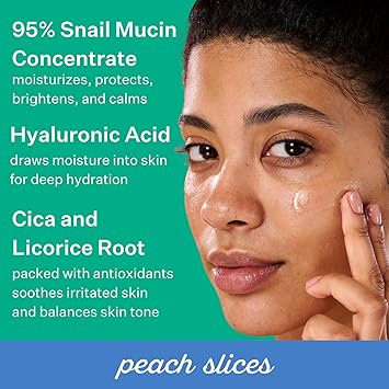 - Snail Mucin: Containing 95% snail mucin concentrate and is celebrated for delivering powerful-yet-gentle results. Snail mucin hydrates, gently exfoliates, purifies, fights blemishes, and diminishes dark spots.