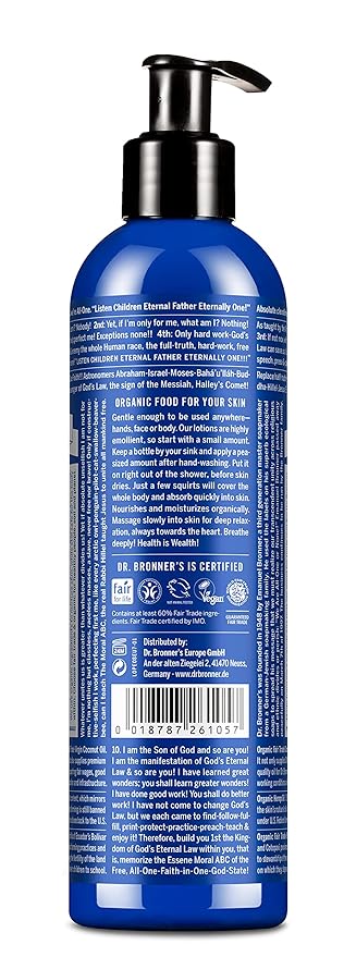 Dr. Bronner's Organic Peppermint Hand and Body Lotion, Made with Oils, Used for Face Body, Certified Fair Trade & Vegan Friendly, 236ml Recycled Bottle