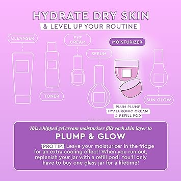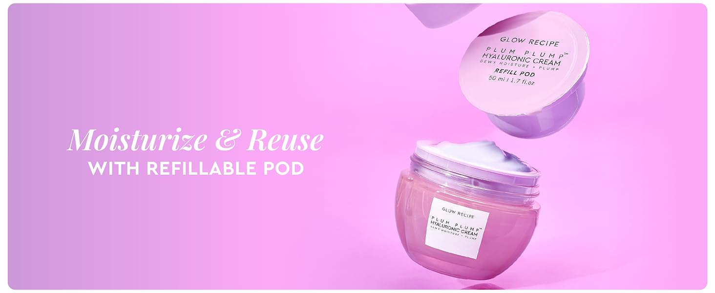 - Plump & Balance Your Skin - Introducing your new favorite daily face moisturizer in its first of its kind refillable jar. Glow Recipe's plum plump hyaluronic acid cream gives each layer of skin intense, juicy hydration. It's gel cream texture is quick-absorbing and non-greasy, revealing a dewy complexion and youthful appearance.