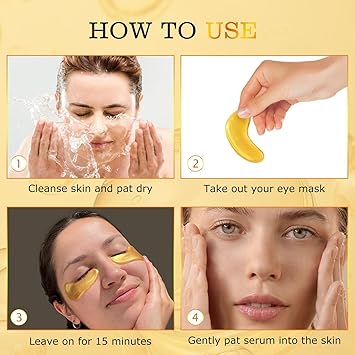 - Easy to Use: Under-eye treatments at skin care centers are expensive and time-consuming, with no guarantee of results. This gold eye mask is not only very easy to use, it is also exceptionally effective. Simply apply our eye mask under your eyes after cleansing with warm water, press gently to hold in place, and leave on for 15-20 minutes. Remove the mask and pat the remaining serum until it is completely absorbed. Give our eye mask a chance and it will give you the ultimate care